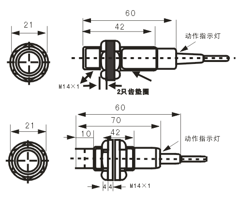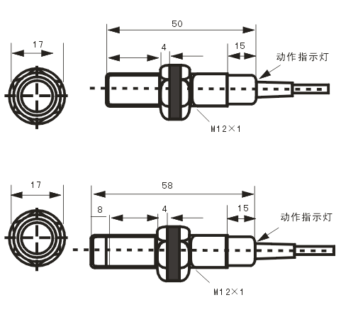 Structural category Cylinder type Outward appearance code ALM6 ALM8 ALM12 ALM14 Appearance Dimension Flush Detection distance 1mm 1mm 2mm 3mm DC6~36VDC NPN NO ALM6-3001NA ALM8-3001NA ALM12-3002NA ALM14-3003NA NC ALM6-3001NB ALM8-3001NB ALM12-3002NB ALM14-3003NB NO+NC ALM12-3002NC ALM14-3003NC PNP NO ALM6-3001PA ALM8-3001PA ALM12-3002PA ALM14-3003PA NC ALM6-3001PB ALM8-3001PB ALM12-3002PB ALM14-3003PB NO+NC ALM12-3002PC ALM14-3003PC two wiresystem NO ALM6-3001LA ALM8-3001LA ALM12-3002LA ALM14-3003LA NC ALM6-3001LB ALM8-3001LB ALM12-3002LB ALM14-3003LB AC90~250VAC SCRControl-lablesilicon NO ALM12-2002A ALM14-2003A NC ALM12-2002B ALM14-2003B NO+NC Relay output N0n-flush Detection distance 1.5mm 1.5mm 4mm 5mm DC6~36VDC NPN NO ALM6-3002NA ALM8-3002NA ALM12-3004NA ALM14-3005NA NC ALM6-3002NB ALM8-3002NB ALM12-3004NB ALM14-3005NB NO+NC ALM12-3004NC ALM14-3005NC PNP NO ALM6-3002PA ALM8-3002PA ALM12-3004PA ALM14-3005PA NC ALM6-3002PB ALM8-3002PB ALM12-3004PB ALM14-3005PB NO+NC ALM12-3004PC ALM14-3005PC two wiresystem NO ALM6-3002LA ALM8-3002LA ALM12-3004LA ALM14-3005LA NC ALM6-3002LB ALM8-3002LB ALM12-3004LB ALM14-3005LB AC90~250VAC SCRControl-lablesilicon NO ALM8-2002LA ALM12-2004A ALM14-2005A NC ALM12-2004B ALM14-2005B NO+NC Relay output Controloutput DC 150mA 150mA 200mA 200mA SCR Relay 300mA 300mA Output voltage dropDC/AC DC < 3VAC < 10V Consumption current DC < 15mAAC < 10mA Standard detected object 661(A3 iron) 881(A3 iron) 15151(A3 iron) 15151(A3 iron) Repeated precision 0.01 0.01 0.01 0.02 DC/AC Response frequency 500Hz 500Hz 400Hz/25Hz 300Hz/25Hz Working environment temperatuer -25 ~+75 -25 ~+75 -25 ~+75 -25 ~+75 Insulation resistance 30M 50M 50M 50M Shell material Stainless steel Metal Metal Metal Protection grade IP67 IP67 IP67 IP67 Altemative model at home and abroad E2E-X1R5 E2E-X5 LJ14A3-